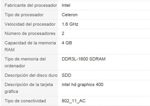 Procesador Intel Celeron N3060 (Dual-Core 1.6 Ghz, hasta 2.48 GHz turbo, cache de 2 MB). Memoria RAM de 4 GB DDR3L 1600 MHz (1 x 4 GB, máxima de 8 GB). Disco SSD de 64 GB EMMC. Tarjeta gráfica integrada Intel HD Graphics 400. Sistem operativo Windows 10 Home (64 bit). Cámara 0.3 MEGA con single mic. Dolby DS1.0 Home Theatre. Software: Office Desktop.